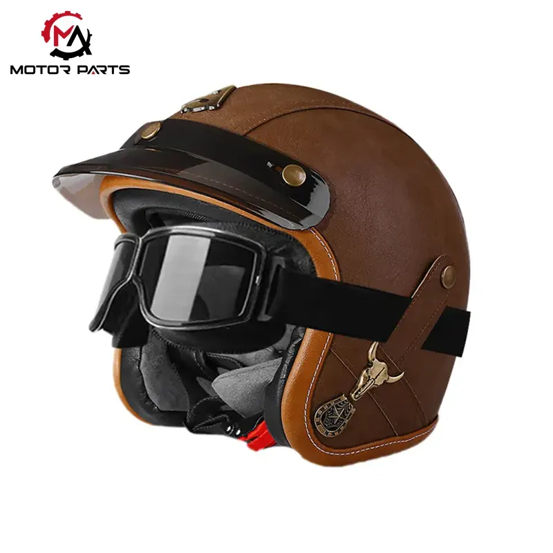 หนังหมวกกันน็อคครึ่งหน้าสำหรับรถจักรยานยนต์พร้อมแว่นตาแบบปรับแต่งได้เป็นผลิตภัณฑ์หมวกกันน็อคครึ่งใบสุดคลาสสิกจาก Max Trading ในประเทศจีน ออกแบบมาสำหรับผู้ชื่นชอบการขับขี่ในเมืองและรถจักรยานยนต์แนววินเทจ