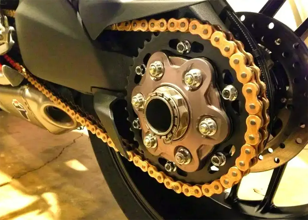 ในบรรดารูปแบบการส่งกำลังของรถจักรยานยนต์หลายๆ รุ่น ระบบส่งกำลังแบบโซ่และเฟืองได้กลายเป็นตัวเลือกยอดนิยมสำหรับรถจักรยานยนต์หลายๆ รุ่น เนื่องจากมีลักษณะที่เรียบง่ายและมีประสิทธิภาพ มีประสิทธิภาพการส่งผ่านสูงและน้ำหนักเบาโดยรวมเหมาะอย่างยิ่งสำหรับรถประเภทที่ต้องการแรงบิดสูง อย่างไรก็ตาม ยังมีข้อจำกัดบางประการ เช่น การสึกหรอและเสียงรบกวนระหว่างการใช้งาน ในระหว่างกระบวนการส่งกำลังเครื่องยนต์ไปยังล้อหลัง การขยายแรงบิดและการปรับอัตราส่วนการลดสามารถทำได้โดยการปรับอัตราส่วนฟันของเฟืองหน้าและเฟืองหลัง